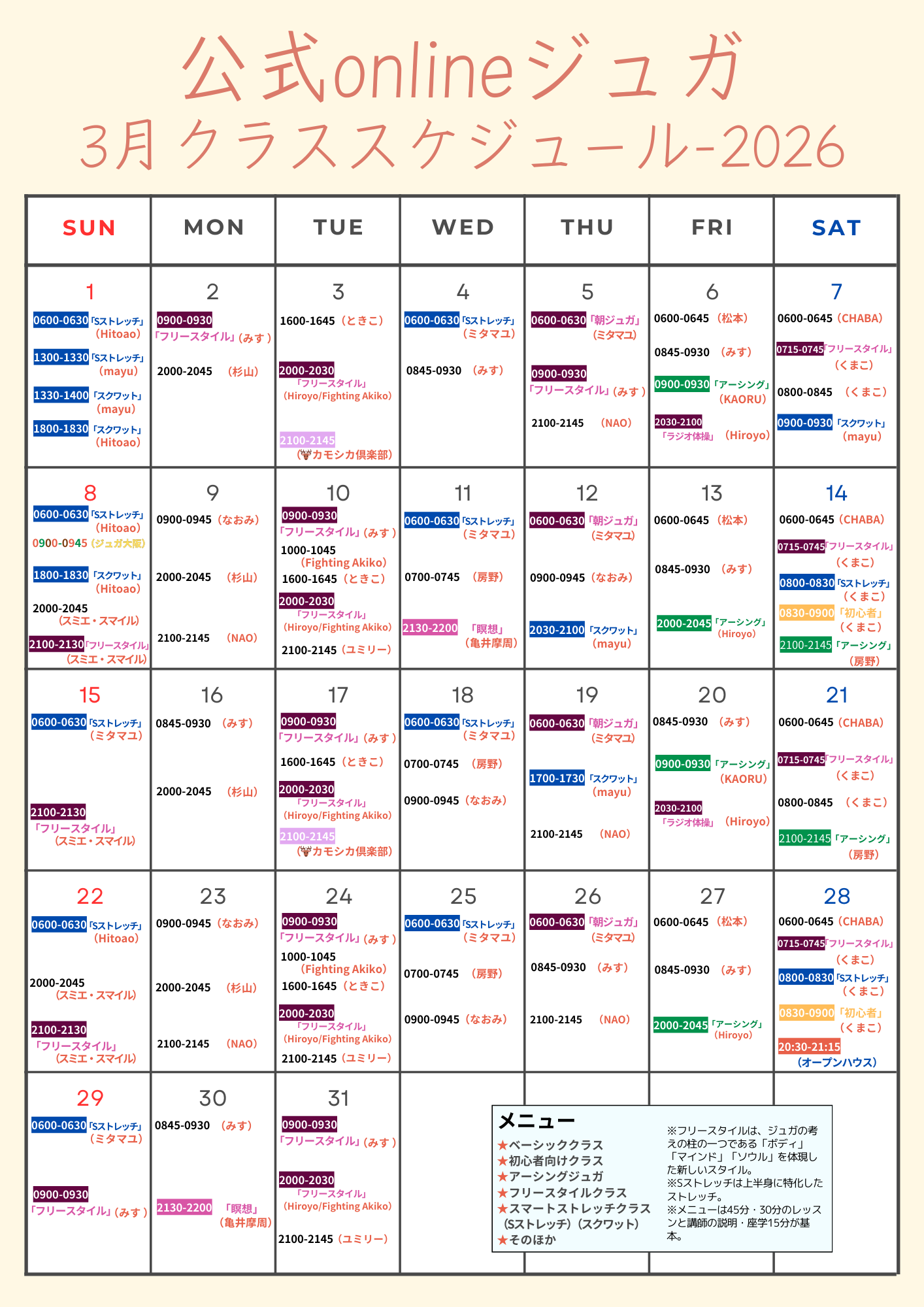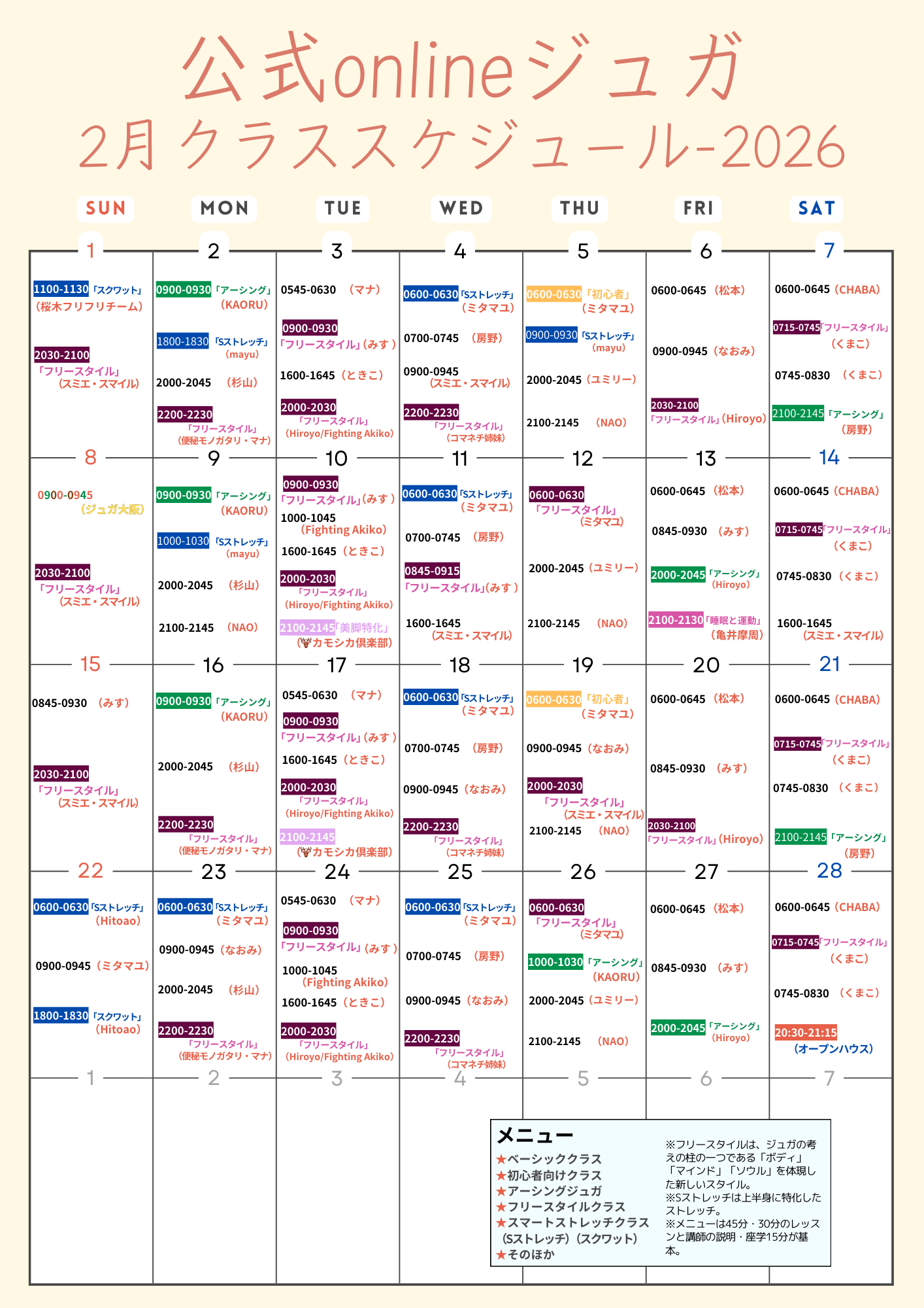 2月のスケジュール こちらでは最新のスケジュールを表示しています。(2/8現在)更新。 ※最新のスケジュールは必ずこのページからご確認ください。 ◎このページのカレンダーは常に最新状態を確認できます。 ◎レッスン日が増える可能性があります。(現在の予定がキャンセルになることはありません) ◎やむを得ない理由によりインストラクターが交代することがあります。